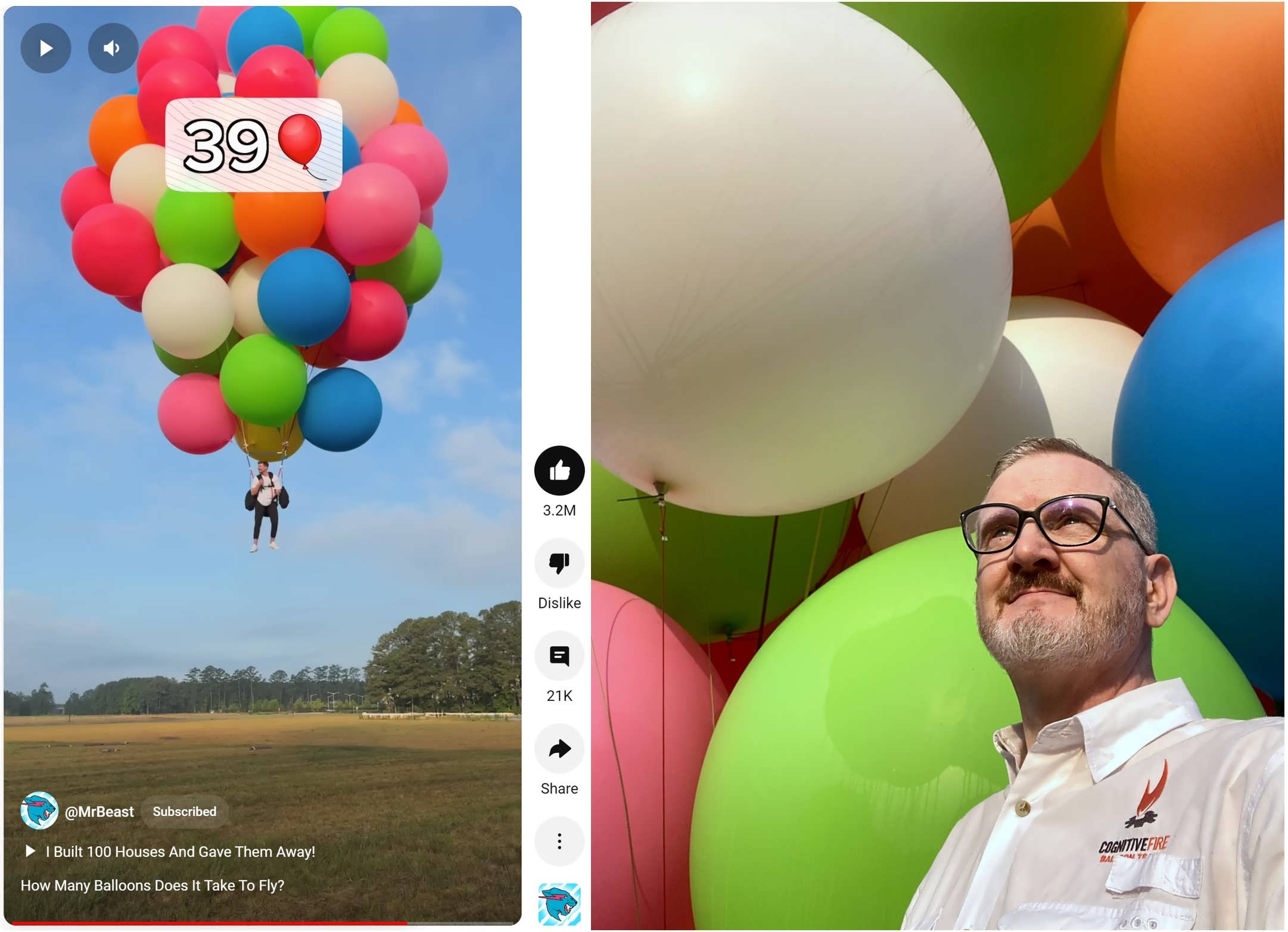 The iconic MrBeast made the decision to float away using only a pastel rainbow of balloons filled with a lighter-than-air gas. MrBeast lifted off from Greenville, North Carolina-- and floated into the sky, just like the childhood dream of flight.